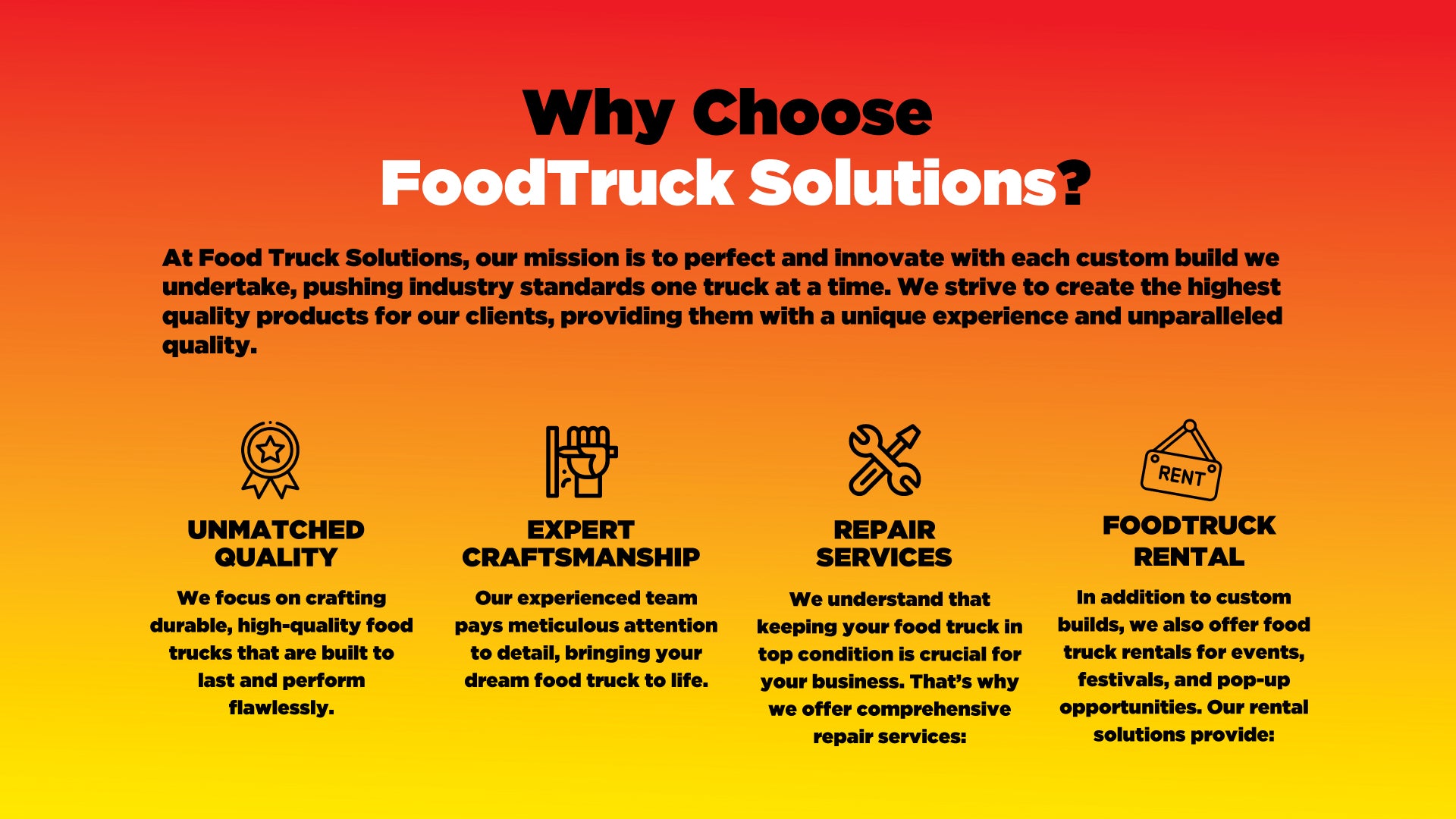 WE SPECIALIZE IN CUSTOM-BUILT FOOD TRUCKS/TRAILERS THAT ARE DESIGNED TO YOUR EXACT SPECIFICATIONS. OUR TEAM OF EXPERIENCED CRAFTSMEN USE ONLY THE HIGHEST QUALITY MATERIALS & EQUIPMENT TO MAKE YOUR DREAMS A REALITY.